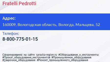 Fratelli Pedrotti по адресу 160009, Вологодская область, Вологда, Мальцева, 52 в дальнейшем Организация, размещена в следующих категориях: