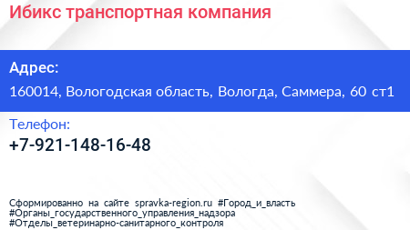 Ибикс, транспортная компания по адресу 160014, Вологодская область, Вологда, Саммера, 60 ст1 в дальнейшем Организация, размещена в следующих категориях: