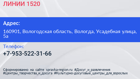 ЛИНИИ 1520 по адресу 160901, Вологодская область, Вологда, Усадебная улица, 5а в дальнейшем Организация, размещена в следующих категориях: