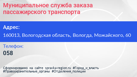 Муниципальное, служба заказа пассажирского транспорта по адресу 160013, Вологодская область, Вологда, Можайского, 60 в дальнейшем Организация, размещена в следующих категориях: