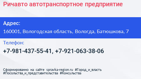 Ричавто, автотранспортное предприятие по адресу 160001, Вологодская область, Вологда, Батюшкова, 7 в дальнейшем Организация, размещена в следующих категориях: