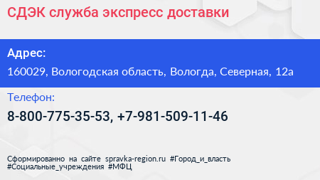 СДЭК, служба экспресс-доставки по адресу 160029, Вологодская область, Вологда, Северная, 12а в дальнейшем Организация, размещена в следующих категориях: