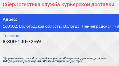 СберЛогистика, служба курьерской доставки по адресу 160002, Вологодская область, Вологда, Ленинградская, 78 в дальнейшем Организация, размещена в следующих категориях:
