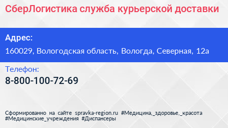 СберЛогистика, служба курьерской доставки по адресу 160029, Вологодская область, Вологда, Северная, 12а в дальнейшем Организация, размещена в следующих категориях: