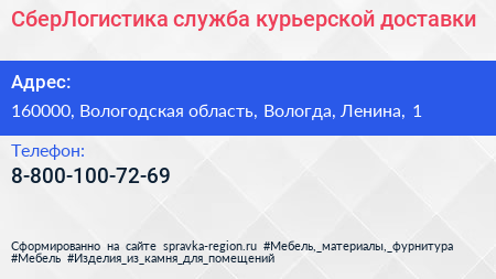 СберЛогистика, служба курьерской доставки по адресу 160000, Вологодская область, Вологда, Ленина, 1 в дальнейшем Организация, размещена в следующих категориях: