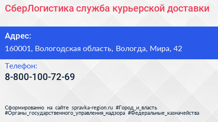 СберЛогистика, служба курьерской доставки по адресу 160001, Вологодская область, Вологда, Мира, 42 в дальнейшем Организация, размещена в следующих категориях: