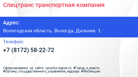 Спецтранс, транспортная компания по адресу Вологодская область, Вологда, Дальняя, 1 в дальнейшем Организация, размещена в следующих категориях: