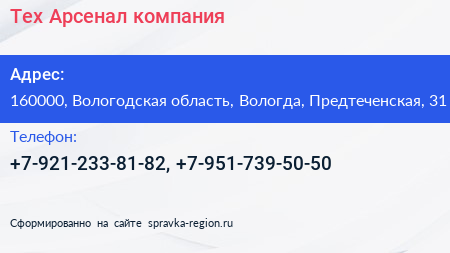 Тех-Арсенал, компания по адресу 160000, Вологодская область, Вологда, Предтеченская, 31 в дальнейшем Организация, размещена в следующих категориях: