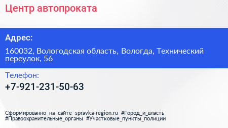 Центр автопроката по адресу 160032, Вологодская область, Вологда, Технический переулок, 56 в дальнейшем Организация, размещена в следующих категориях: