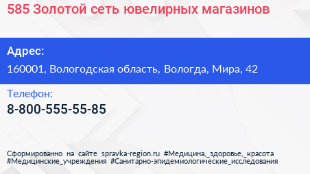 585 Золотой, сеть ювелирных магазинов по адресу 160001, Вологодская область, Вологда, Мира, 42 в дальнейшем Организация, размещена в следующих категориях: