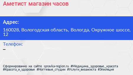 Аметист, магазин часов по адресу 160028, Вологодская область, Вологда, Окружное шоссе, 12 в дальнейшем Организация, размещена в следующих категориях: