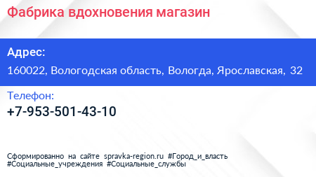 Фабрика вдохновения, магазин по адресу 160022, Вологодская область, Вологда, Ярославская, 32 в дальнейшем Организация, размещена в следующих категориях: