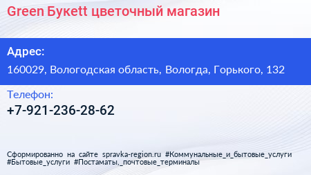 Green Букеtt, цветочный магазин по адресу 160029, Вологодская область, Вологда, Горького, 132 в дальнейшем Организация, размещена в следующих категориях: