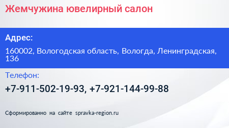 Жемчужина, ювелирный салон по адресу 160002, Вологодская область, Вологда, Ленинградская, 136 в дальнейшем Организация, размещена в следующих категориях: