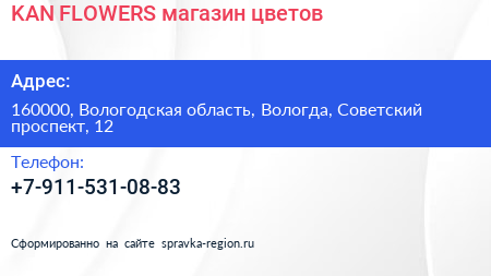 KAN FLOWERS, магазин цветов по адресу 160000, Вологодская область, Вологда, Советский проспект, 12 в дальнейшем Организация, размещена в следующих категориях: