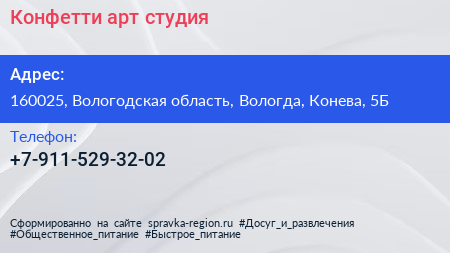 Конфетти, арт-студия по адресу 160025, Вологодская область, Вологда, Конева, 5Б в дальнейшем Организация, размещена в следующих категориях: