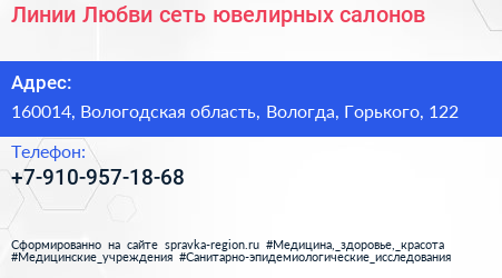 Линии Любви, сеть ювелирных салонов по адресу 160014, Вологодская область, Вологда, Горького, 122 в дальнейшем Организация, размещена в следующих категориях: