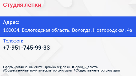 Студия лепки по адресу 160034, Вологодская область, Вологда, Новгородская, 4а в дальнейшем Организация, размещена в следующих категориях: