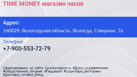 TIME-MONEY, магазин часов по адресу 160029, Вологодская область, Вологда, Северная, 7а в дальнейшем Организация, размещена в следующих категориях: