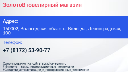 ЗолотоВ, ювелирный магазин по адресу 160002, Вологодская область, Вологда, Ленинградская, 100 в дальнейшем Организация, размещена в следующих категориях:
