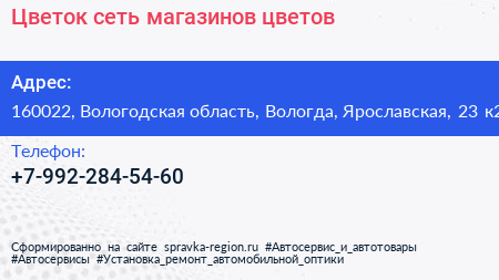 Цветок, сеть магазинов цветов по адресу 160022, Вологодская область, Вологда, Ярославская, 23 к2 в дальнейшем Организация, размещена в следующих категориях: