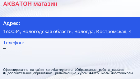АКВАТОН, магазин по адресу 160034, Вологодская область, Вологда, Костромская, 4 в дальнейшем Организация, размещена в следующих категориях: