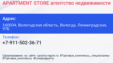 APARTMENT STORE, агентство недвижимости по адресу 160034, Вологодская область, Вологда, Ленинградская, 97Б в дальнейшем Организация, размещена в следующих категориях: