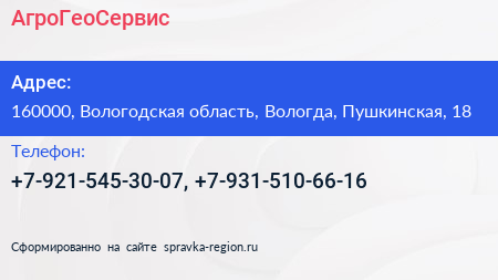 АгроГеоСервис по адресу 160000, Вологодская область, Вологда, Пушкинская, 18 в дальнейшем Организация, размещена в следующих категориях: