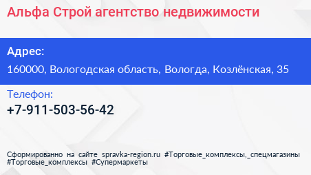Альфа Строй, агентство недвижимости по адресу 160000, Вологодская область, Вологда, Козлёнская, 35 в дальнейшем Организация, размещена в следующих категориях: