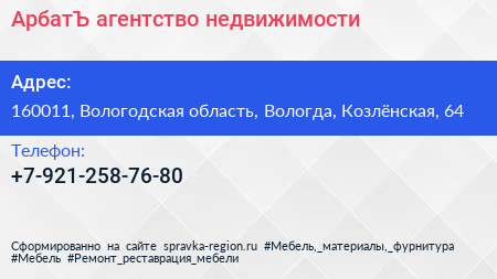 АрбатЪ, агентство недвижимости по адресу 160011, Вологодская область, Вологда, Козлёнская, 64 в дальнейшем Организация, размещена в следующих категориях: