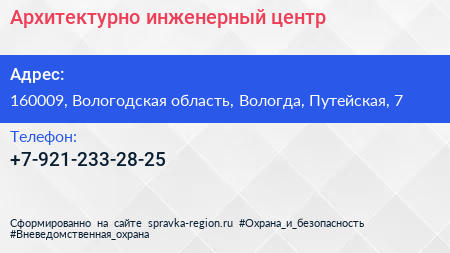 Архитектурно-инженерный центр по адресу 160009, Вологодская область, Вологда, Путейская, 7 в дальнейшем Организация, размещена в следующих категориях: