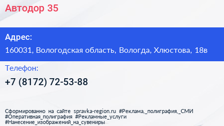 Автодор-35 по адресу 160031, Вологодская область, Вологда, Хлюстова, 18в в дальнейшем Организация, размещена в следующих категориях: