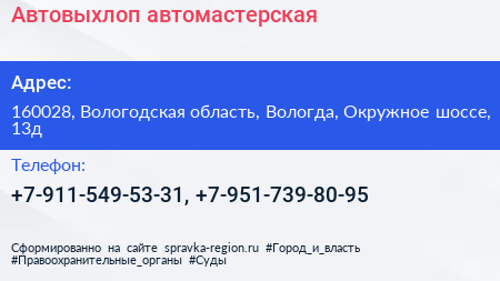 Автовыхлоп, автомастерская по адресу 160028, Вологодская область, Вологда, Окружное шоссе, 13д в дальнейшем Организация, размещена в следующих категориях: