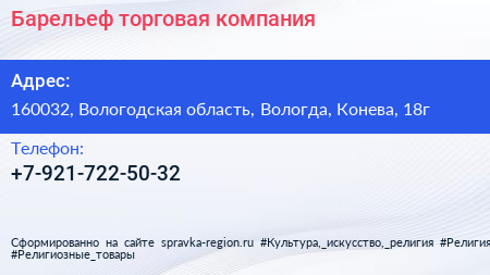 Барельеф, торговая компания по адресу 160032, Вологодская область, Вологда, Конева, 18г в дальнейшем Организация, размещена в следующих категориях:
