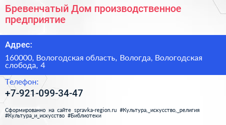 Бревенчатый Дом, производственное предприятие по адресу 160000, Вологодская область, Вологда, Вологодская слобода, 4 в дальнейшем Организация, размещена в следующих категориях: