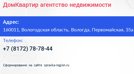 ДомКвартир, агентство недвижимости по адресу 160011, Вологодская область, Вологда, Первомайская, 35а в дальнейшем Организация, размещена в следующих категориях:
