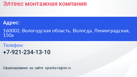 Элтекс, монтажная компания по адресу 160002, Вологодская область, Вологда, Ленинградская, 150а в дальнейшем Организация, размещена в следующих категориях: