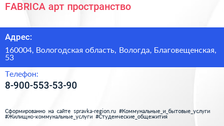 FABRICA, арт-пространство по адресу 160004, Вологодская область, Вологда, Благовещенская, 53 в дальнейшем Организация, размещена в следующих категориях: