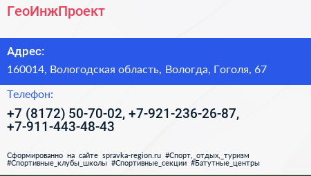 ГеоИнжПроект по адресу 160014, Вологодская область, Вологда, Гоголя, 67 в дальнейшем Организация, размещена в следующих категориях: