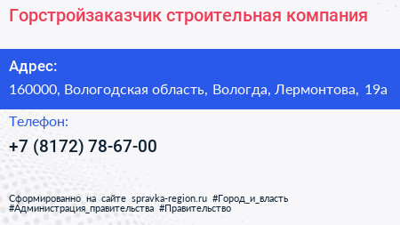 Горстройзаказчик, строительная компания по адресу 160000, Вологодская область, Вологда, Лермонтова, 19а в дальнейшем Организация, размещена в следующих категориях: