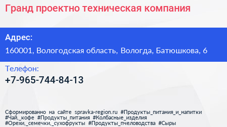 Гранд, проектно-техническая компания по адресу 160001, Вологодская область, Вологда, Батюшкова, 6 в дальнейшем Организация, размещена в следующих категориях: