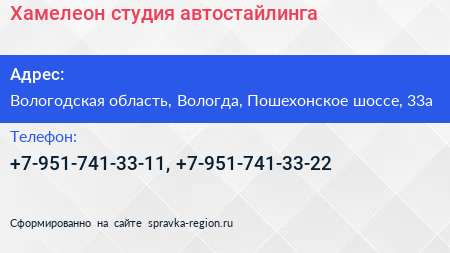 Хамелеон, студия автостайлинга по адресу Вологодская область, Вологда, Пошехонское шоссе, 33а в дальнейшем Организация, размещена в следующих категориях: