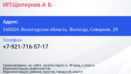 ИП Щелкунов А.Б. по адресу 160024, Вологодская область, Вологда, Северная, 29 в дальнейшем Организация, размещена в следующих категориях: