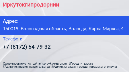 Иркутскгипродорнии по адресу 160019, Вологодская область, Вологда, Карла Маркса, 4 в дальнейшем Организация, размещена в следующих категориях: