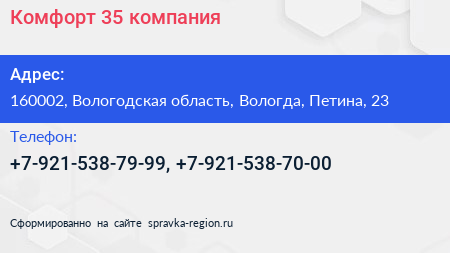 Комфорт 35, компания по адресу 160002, Вологодская область, Вологда, Петина, 23 в дальнейшем Организация, размещена в следующих категориях: