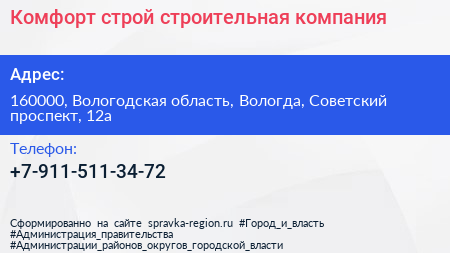 Комфорт-строй, строительная компания по адресу 160000, Вологодская область, Вологда, Советский проспект, 12а в дальнейшем Организация, размещена в следующих категориях: