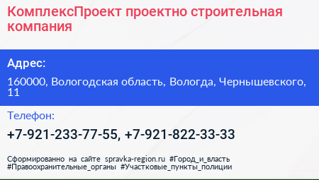 КомплексПроект, проектно-строительная компания по адресу 160000, Вологодская область, Вологда, Чернышевского, 11 в дальнейшем Организация, размещена в следующих категориях: