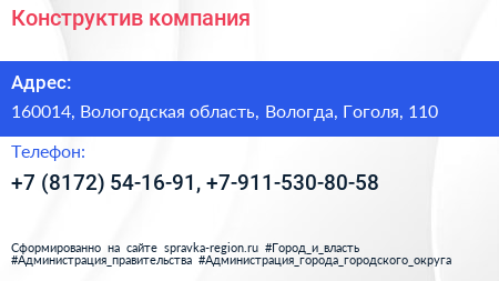 Конструктив, компания по адресу 160014, Вологодская область, Вологда, Гоголя, 110 в дальнейшем Организация, размещена в следующих категориях: