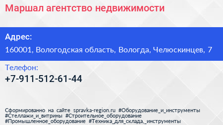 Маршал, агентство недвижимости по адресу 160001, Вологодская область, Вологда, Челюскинцев, 7 в дальнейшем Организация, размещена в следующих категориях:
