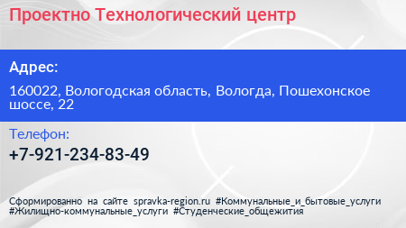 Проектно-Технологический центр по адресу 160022, Вологодская область, Вологда, Пошехонское шоссе, 22 в дальнейшем Организация, размещена в следующих категориях: